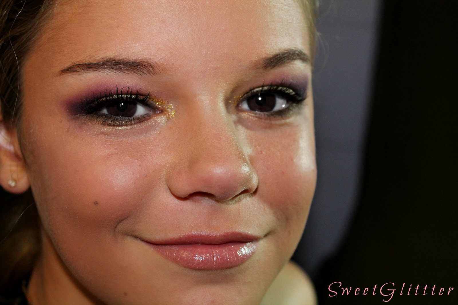 For the eyes, I decided to create a dramatic night out look, using golds and purples with a pop of gold glitter at the inner corners of her eyes.
